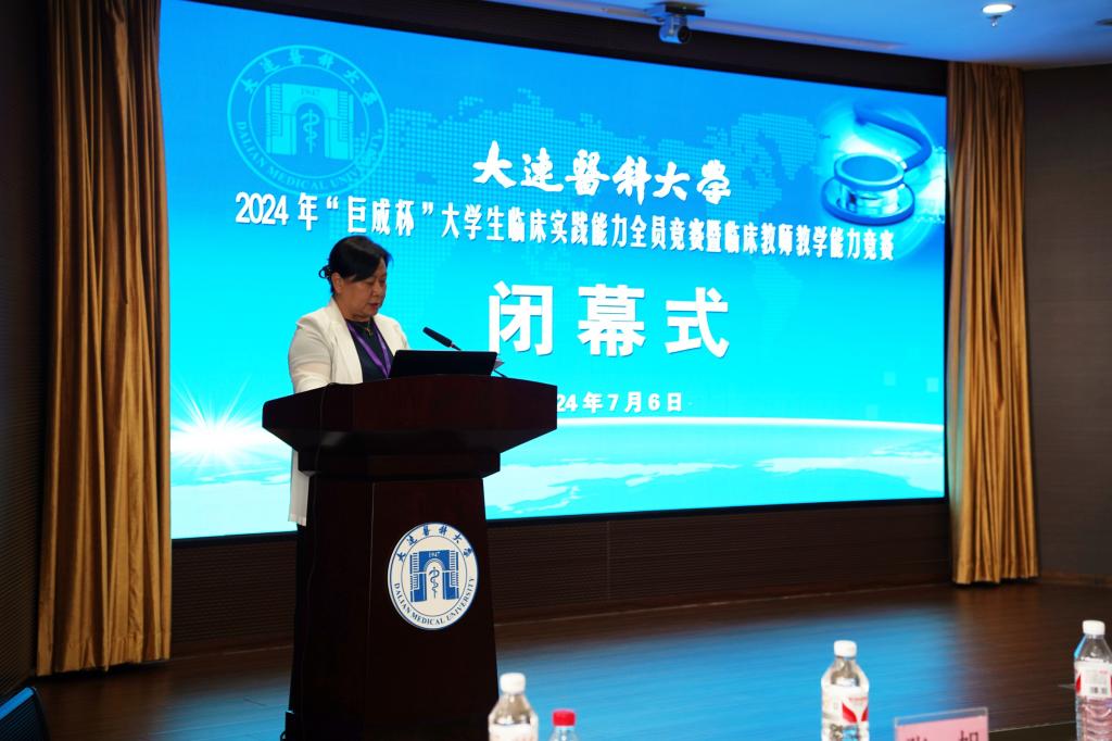 教务处处长孔英致闭幕词,她代表学校向取得优异成绩的各代表队和选手表示祝贺,希望所有附属医院和各教学医院以本次竞赛为契机,深入贯彻落实新时代医学教育高质量发展目标,积极推进课程体系、教学方法、师资队伍和实践教学基地等方面的全面改革。